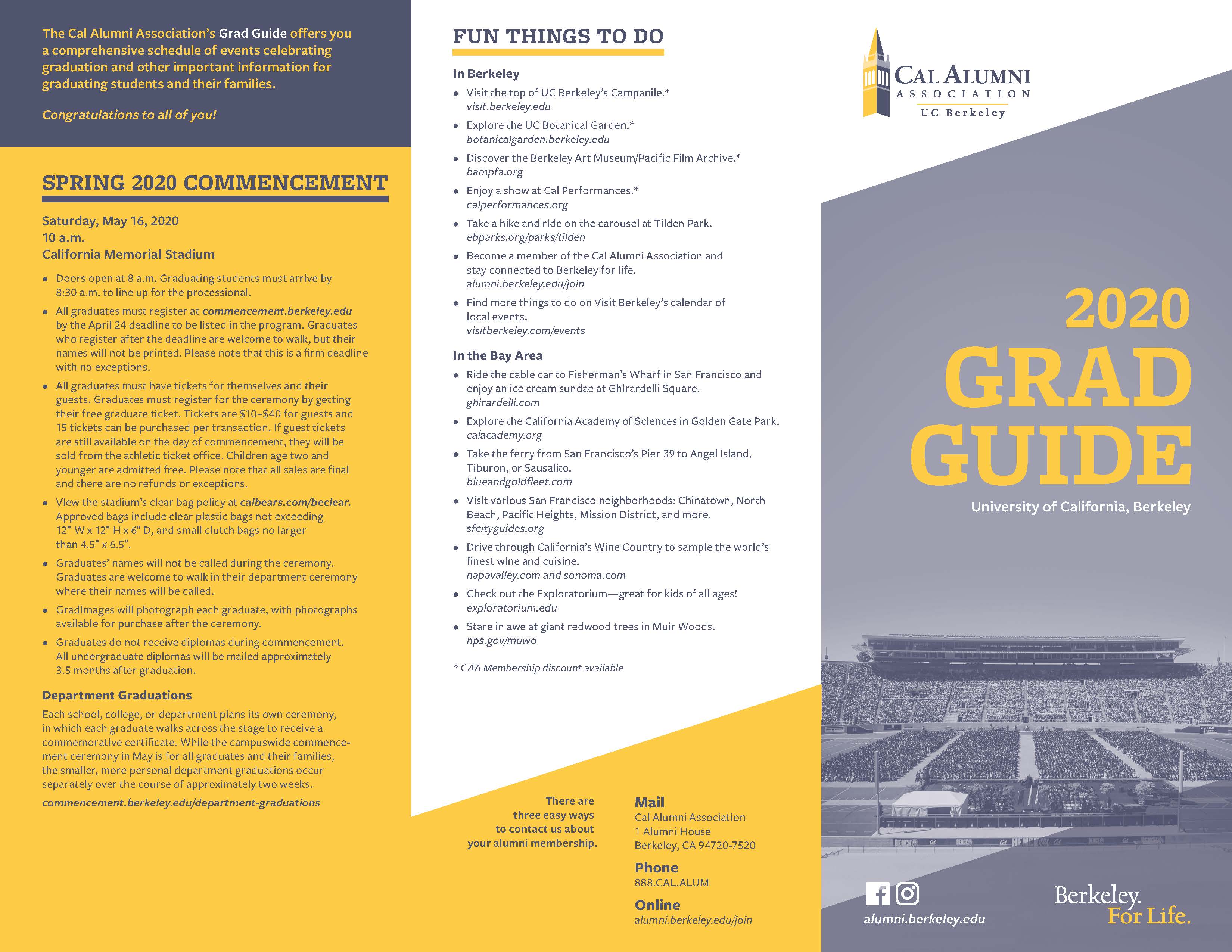 Feel free to download the 2022 Grad Guide when it is available, produced by the Cal Alumni Association, for a comprehensive list of cap, gown and other apparel locations, parking and transportation, lodging, fun things to do, and more. Printed versions will also be available for students to collect from Evans later in the Spring semester.